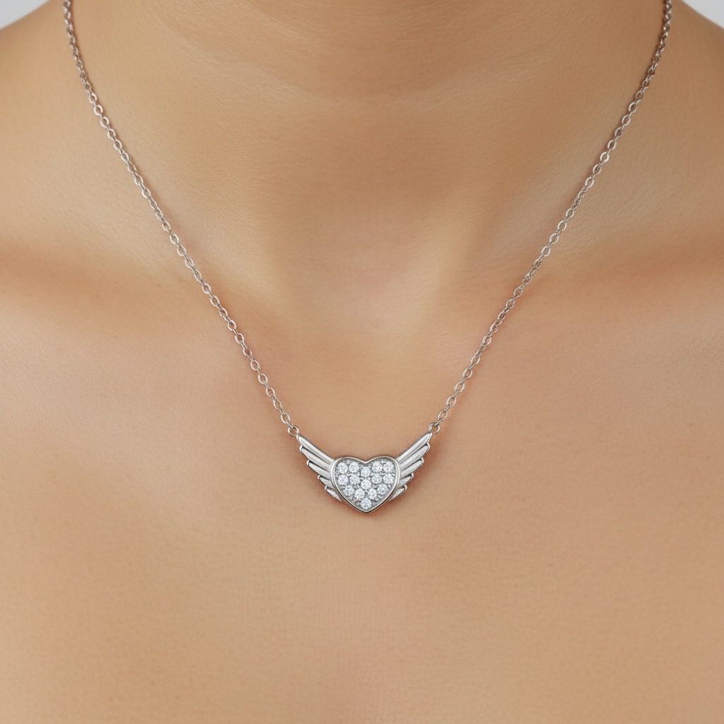 Ένα κομψό κολιέ που συνδυάζει την καρδιά με φτερά, δημιουργώντας ένα ρομαντικό και διαχρονικό σύμβολο. Η καρδιά στο κέντρο είναι διακοσμημένη με λαμπερές λεπτομέρειες που χαρίζουν διακριτική λάμψη και κομψότητα.