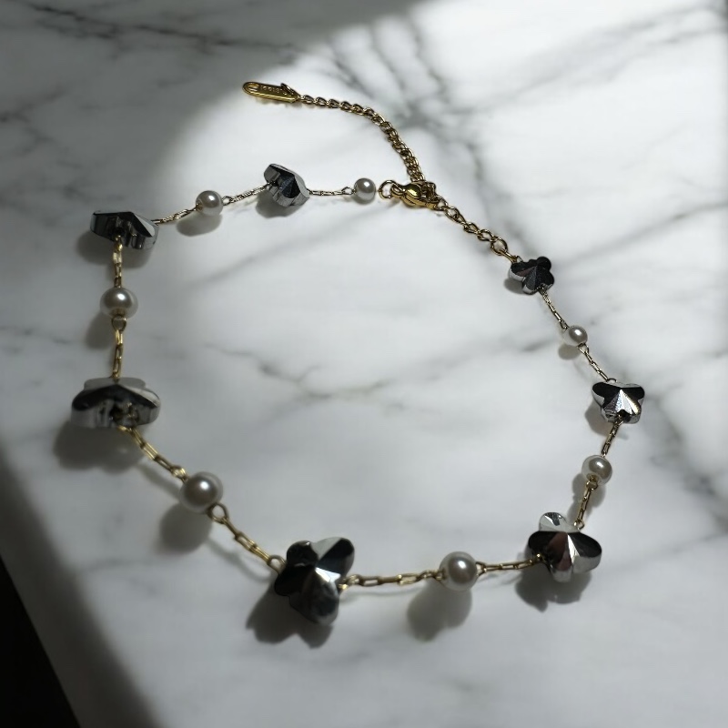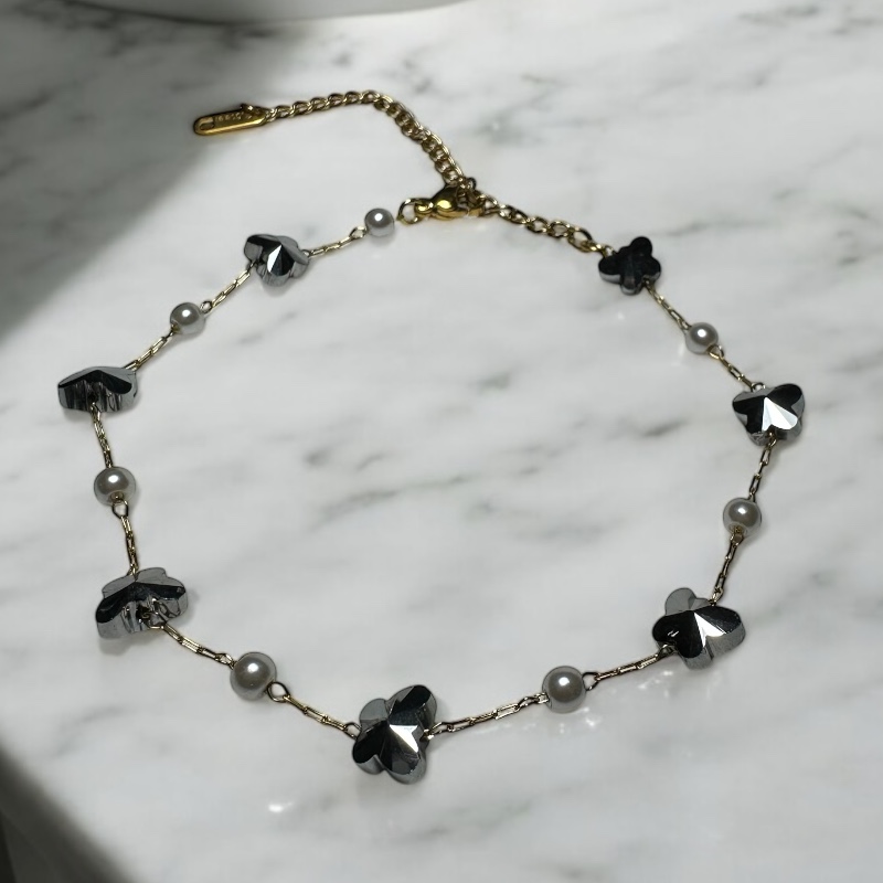 Μοτίβο: Χρυσή λεπτή αλυσίδα με διακοσμητικά μεταλλικά butterfly charms και πέρλες