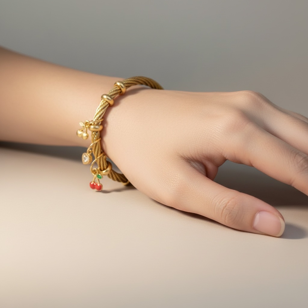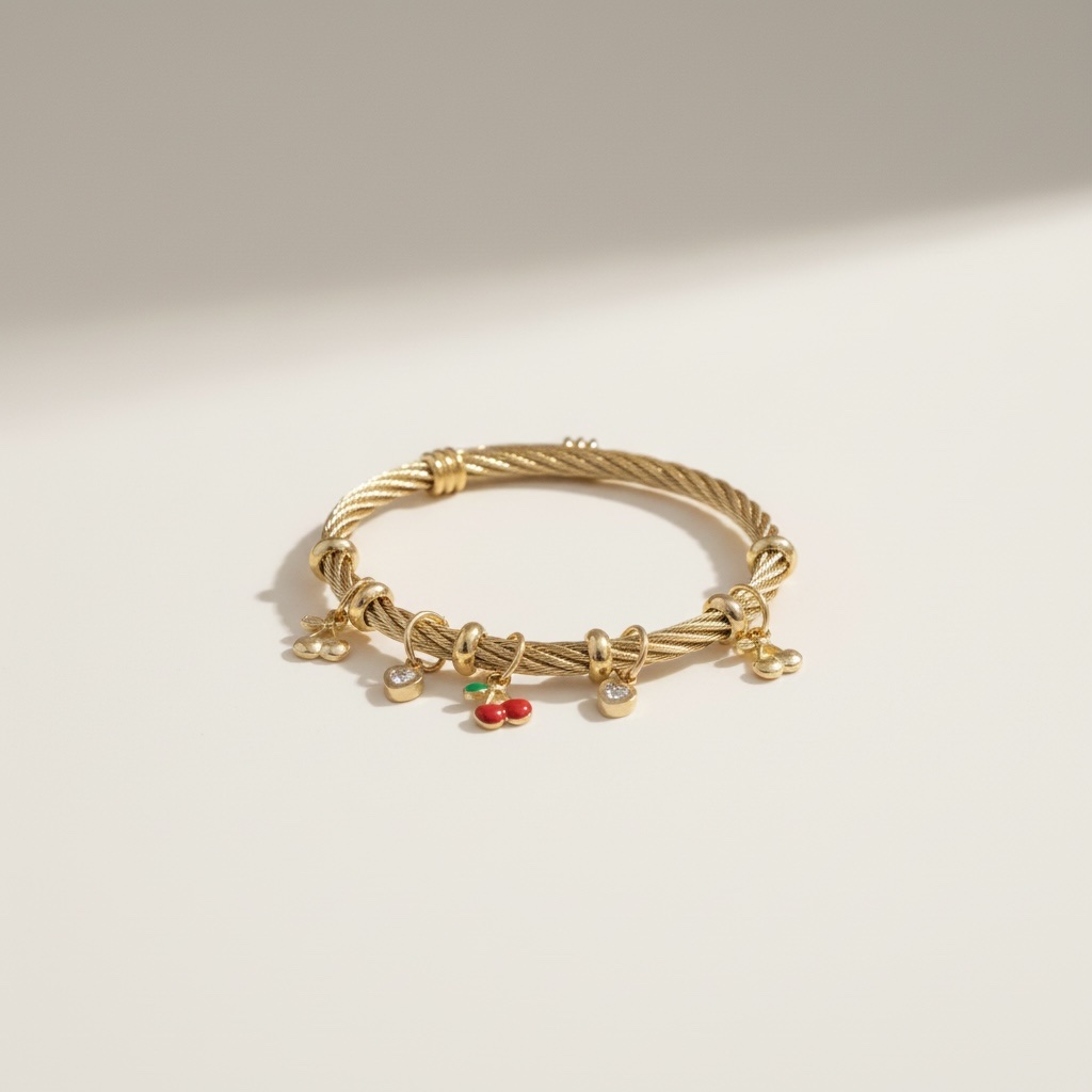 Το Cherry Glow Bracelet είναι ένα ξεχωριστό βραχιόλι που συνδυάζει κομψότητα με playful λεπτομέρειες. Το ιδιαίτερο πλεκτό μεταλλικό του σχέδιο χαρίζει μοντέρνο χαρακτήρα, ενώ τα μικρά κρεμαστά charms με κερασάκια και καρδιές δίνουν μία γλυκιά και θηλυκή πινελιά.