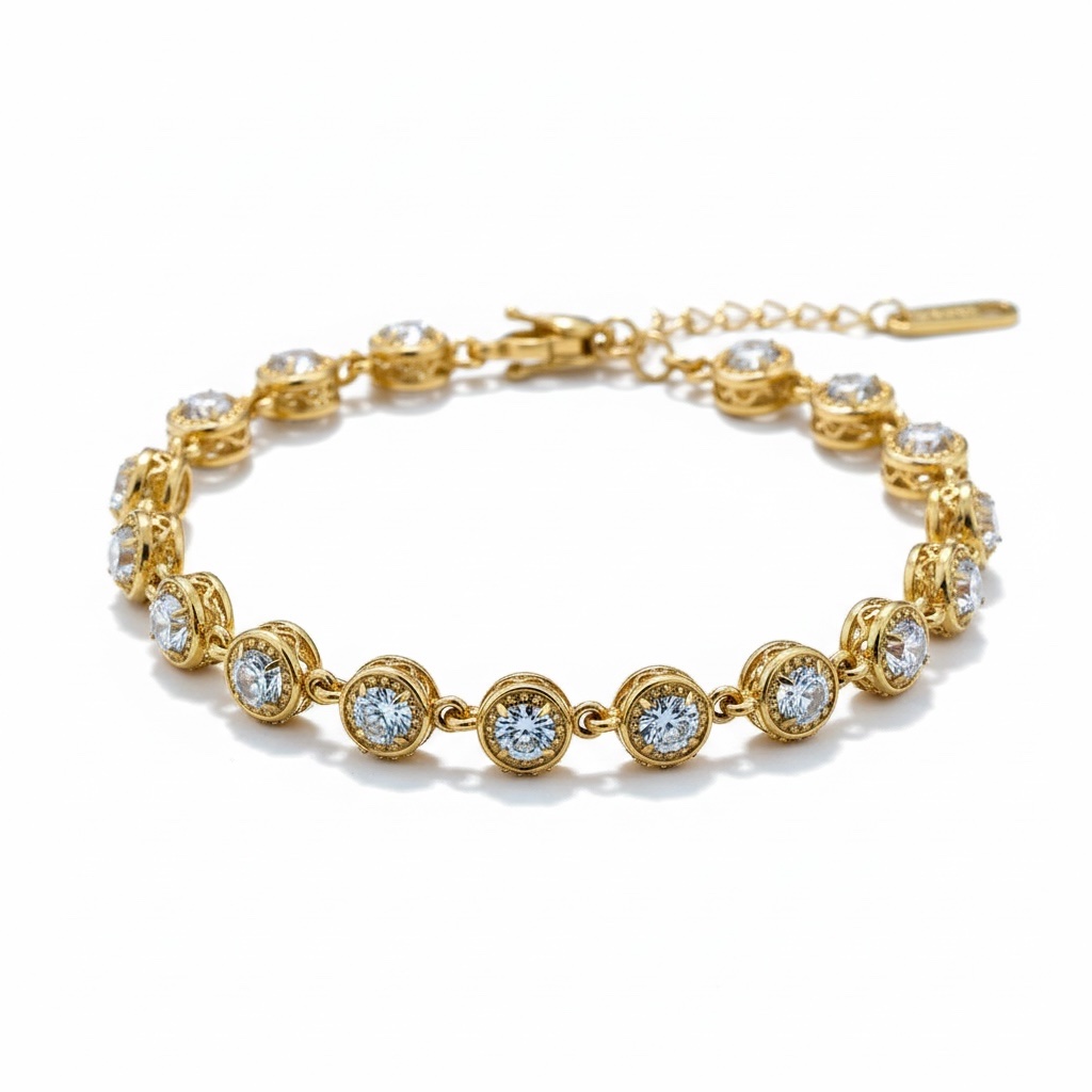 Ένα λαμπερό tennis bracelet με διαδοχικά στρογγυλά στοιχεία που αγκαλιάζουν τον καρπό και χαρίζουν μοναδική φωτεινότητα σε κάθε κίνηση. Το κεντρικό ζιργκόν πλαισιώνεται από μικρότερες πέτρες δημιουργώντας ένα κομψό halo effect που αποπνέει διαχρονική πολυτέλεια. Φοριέται άνετα από το πρωί έως το βράδυ, μόνο του για minimal chic αποτέλεσμα ή σε συνδυασμό με άλλα βραχιόλια για πιο fashion layering. Ένα κόσμημα που προσθέτει λάμψη σε κάθε σου look.