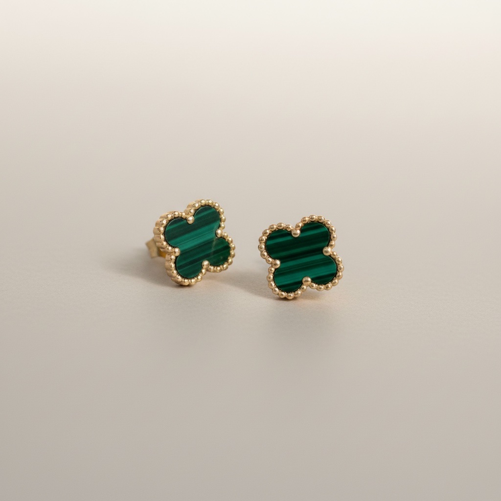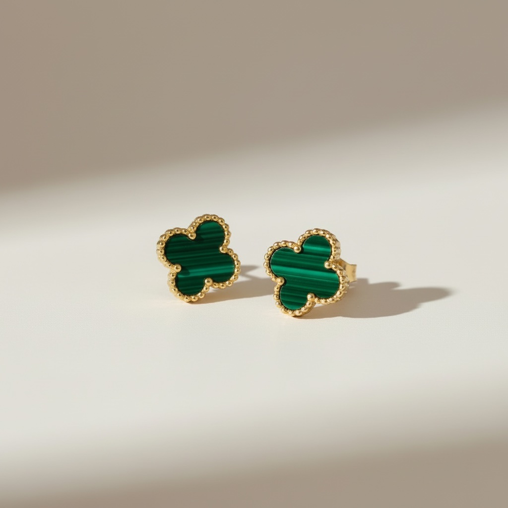 Τα Emerald Clover Stud Earrings ξεχωρίζουν για το έντονο πράσινο χρώμα τους που αποπνέει πολυτέλεια και φρεσκάδα. Το σχέδιο τετράφυλλου, σύμβολο τύχης, σε συνδυασμό με το marble εφέ της επιφάνειας, δημιουργεί ένα κόσμημα που τραβάει τα βλέμματα χωρίς να είναι υπερβολικό.