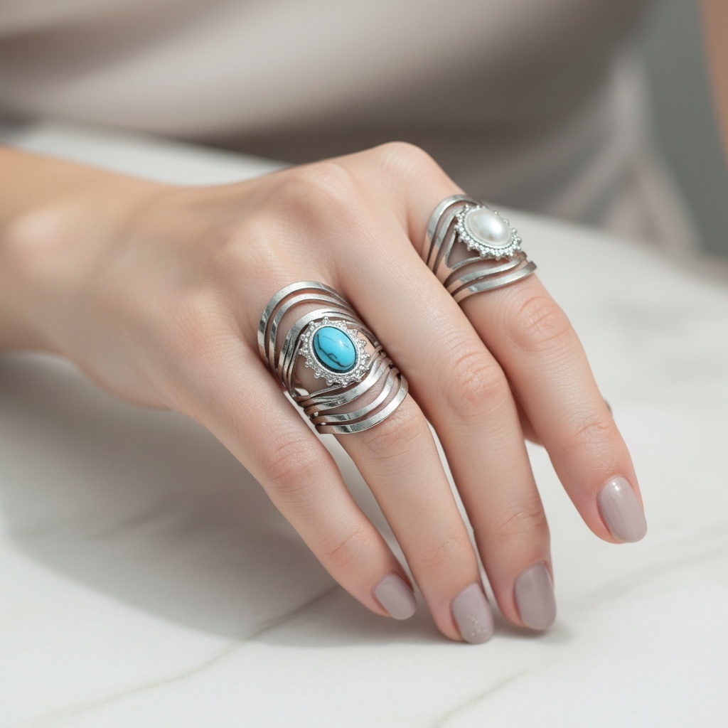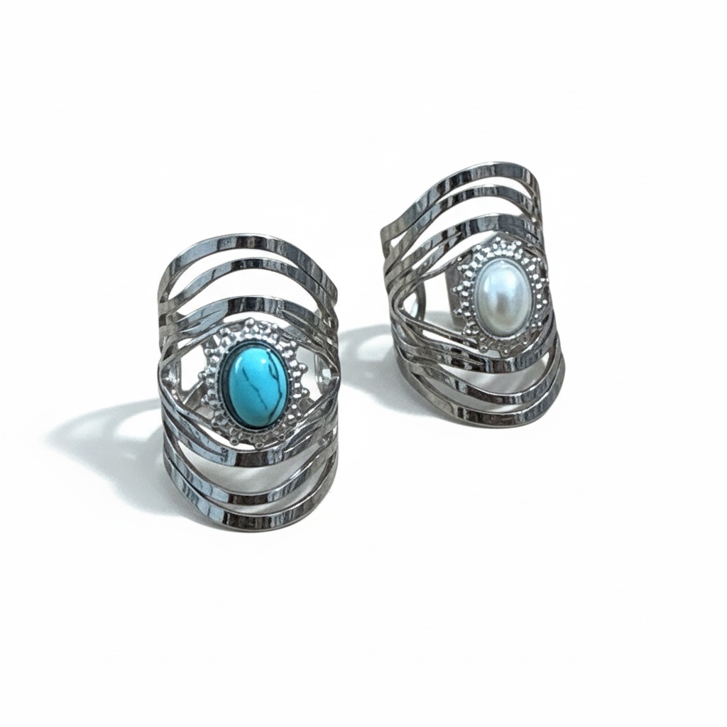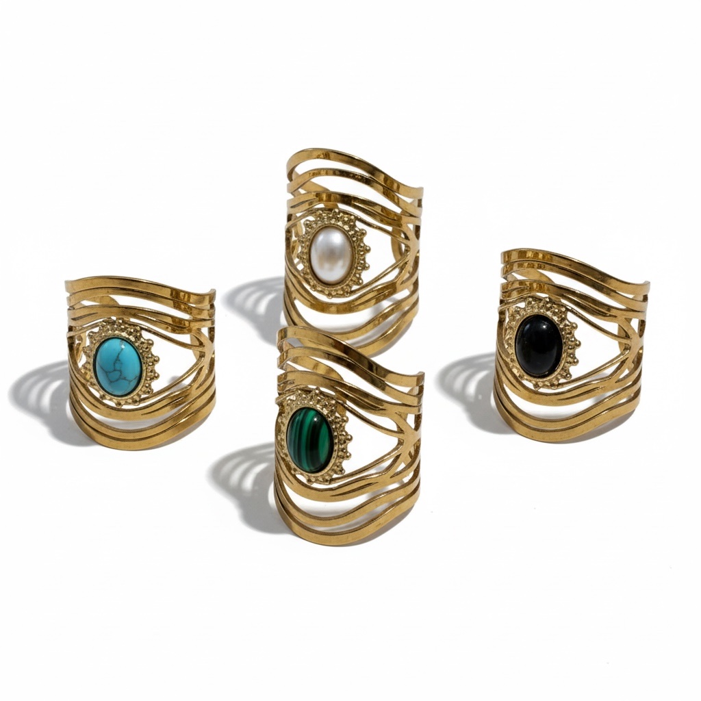 Ένα εντυπωσιακό δαχτυλίδι με δυναμικό χαρακτήρα και καλλιτεχνική αισθητική. Οι πολλαπλές μεταλλικές γραμμές αγκαλιάζουν το δάχτυλο δημιουργώντας ένα μοναδικό layered αποτέλεσμα, ενώ η κεντρική πέτρα σε eye-inspired σχέδιο προσθέτει ένταση και προσωπικότητα.