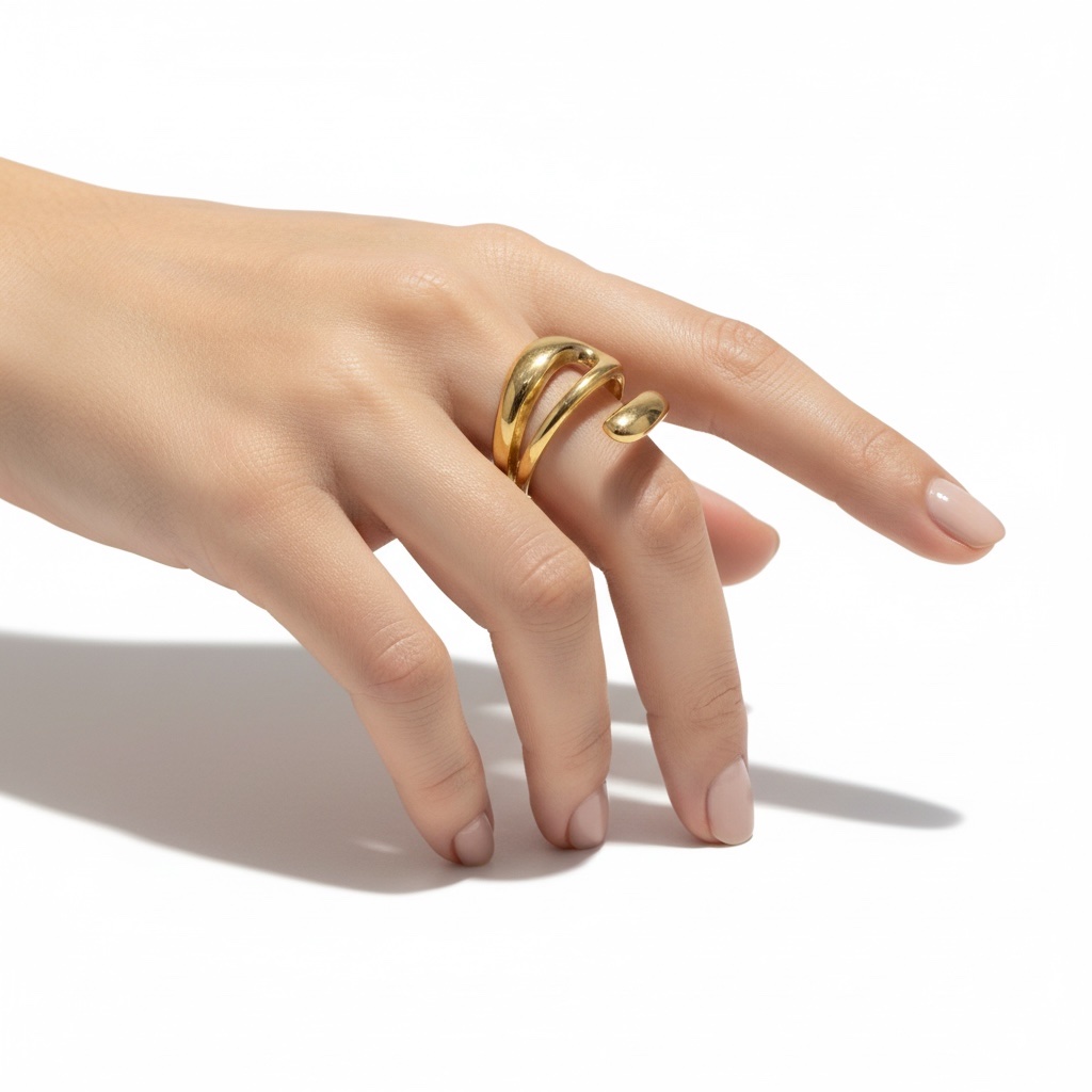 Το Fluid Curve Ring ξεχωρίζει για τη ρευστή, οργανική του φόρμα που θυμίζει φυσική κίνηση και μοντέρνα γλυπτική.