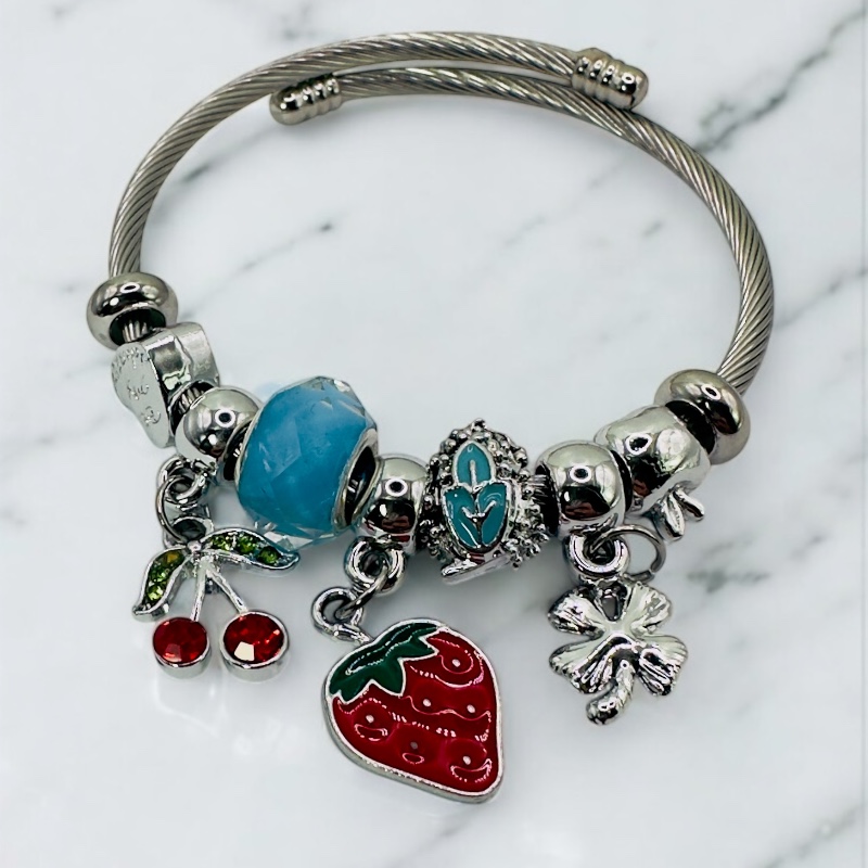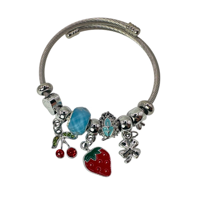 Μοτίβο: Κρεμαστά charms φράουλα, κεράσι και τριφύλλι με γαλάζια χάντρα