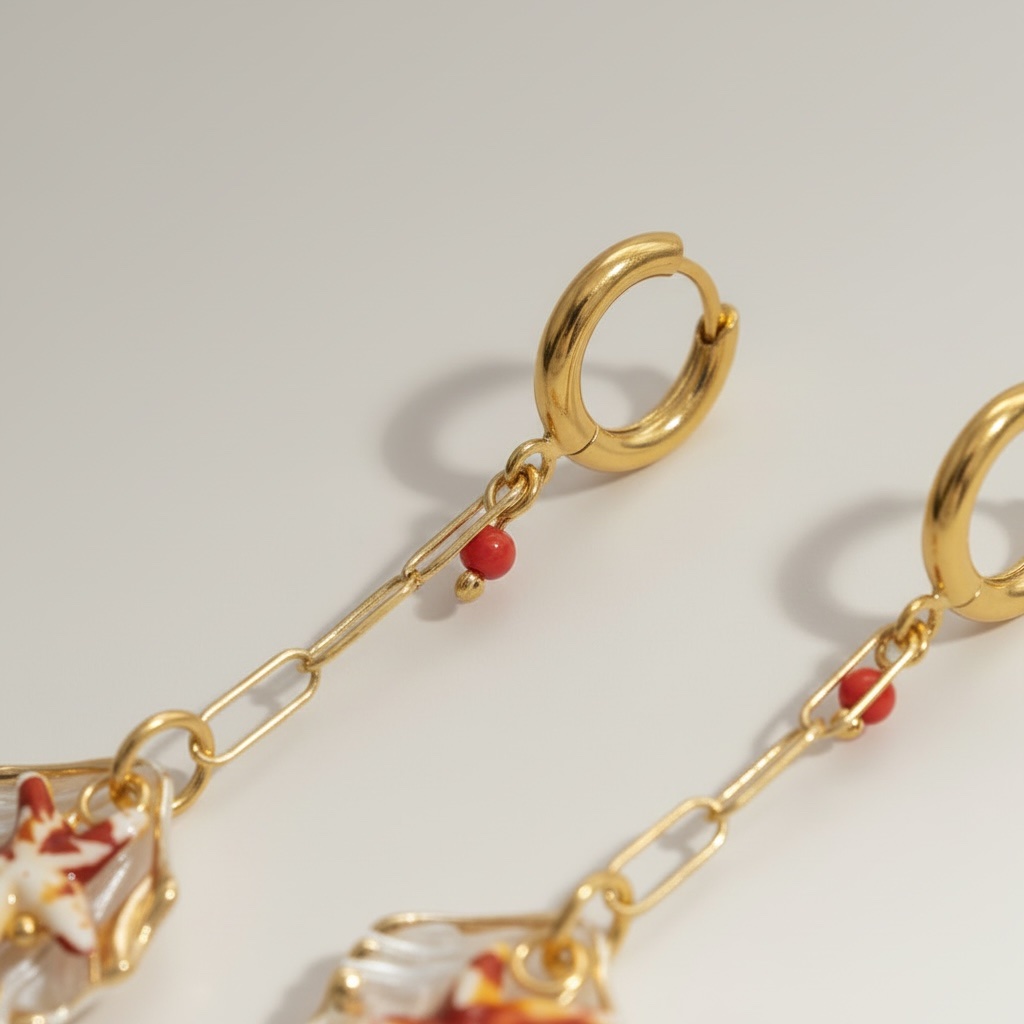 Τα Golden Coral Star Shell Earrings συνδυάζουν δύο από τα πιο αγαπημένα καλοκαιρινά στοιχεία — το κοχύλι και τον αστερία — σε ένα μοναδικό και εντυπωσιακό σχέδιο. Οι κόκκινες λεπτομέρειες προσθέτουν ένταση και ζεστασιά, δημιουργώντας ένα κόσμημα που ξεχωρίζει.