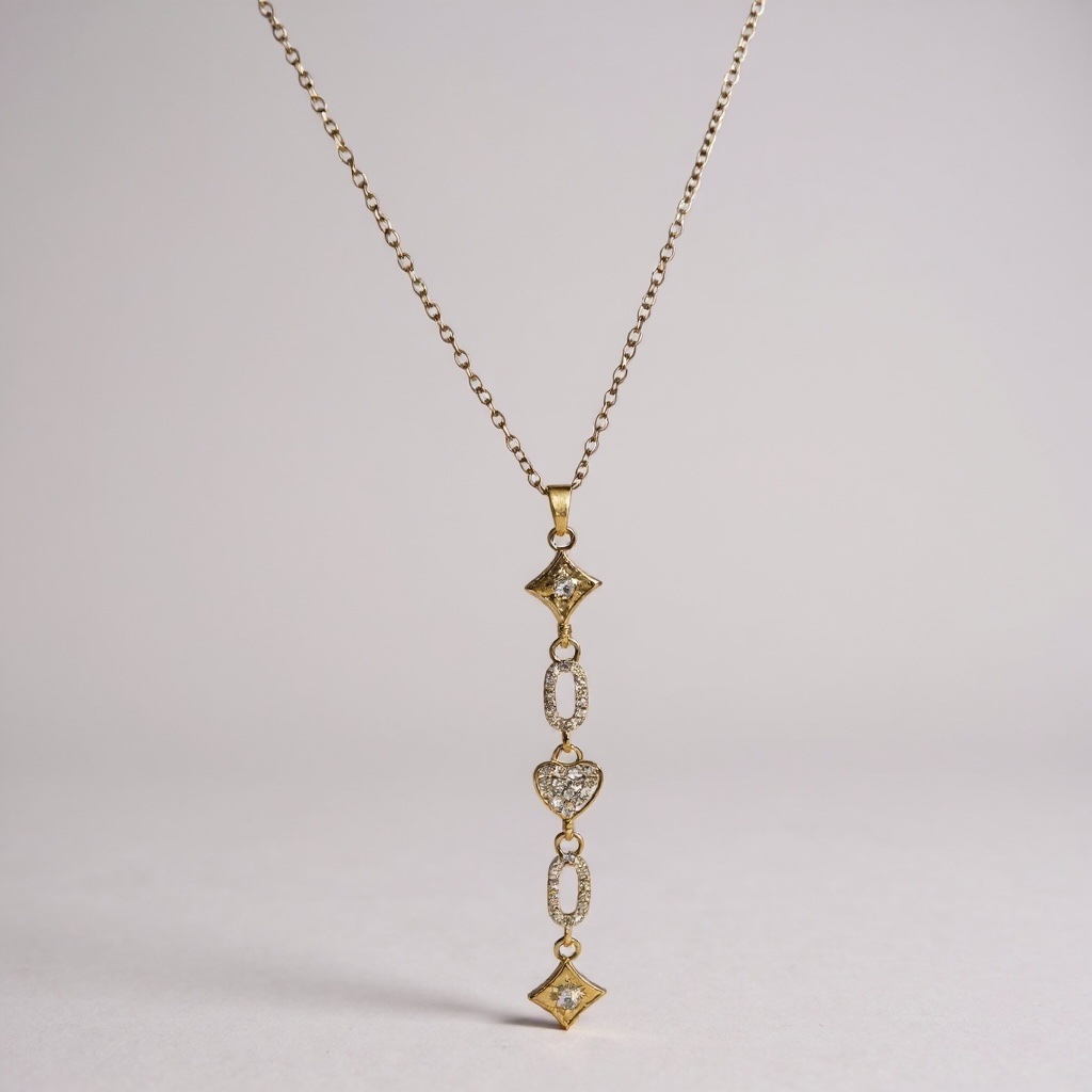 Το Heart & Crystal Drop Necklace ξεχωρίζει για τον κομψό και εκλεπτυσμένο σχεδιασμό του. Τα διαδοχικά στοιχεία με κρύσταλλα δημιουργούν ένα κάθετο αποτέλεσμα που κολακεύει τον λαιμό, ενώ η καρδιά στο κέντρο προσθέτει μια διακριτική ρομαντική πινελιά.