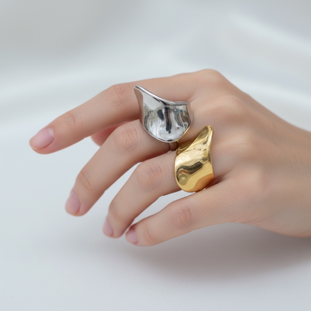 Το Liquid Curve Ring εμπνέεται από τη φυσική ροή και τις απαλές καμπύλες, δημιουργώντας ένα κόσμημα με έντονη παρουσία αλλά καθαρή αισθητική. Η γυαλιστερή επιφάνειά του αντανακλά το φως, προσθέτοντας μοντέρνα λάμψη σε κάθε εμφάνιση.