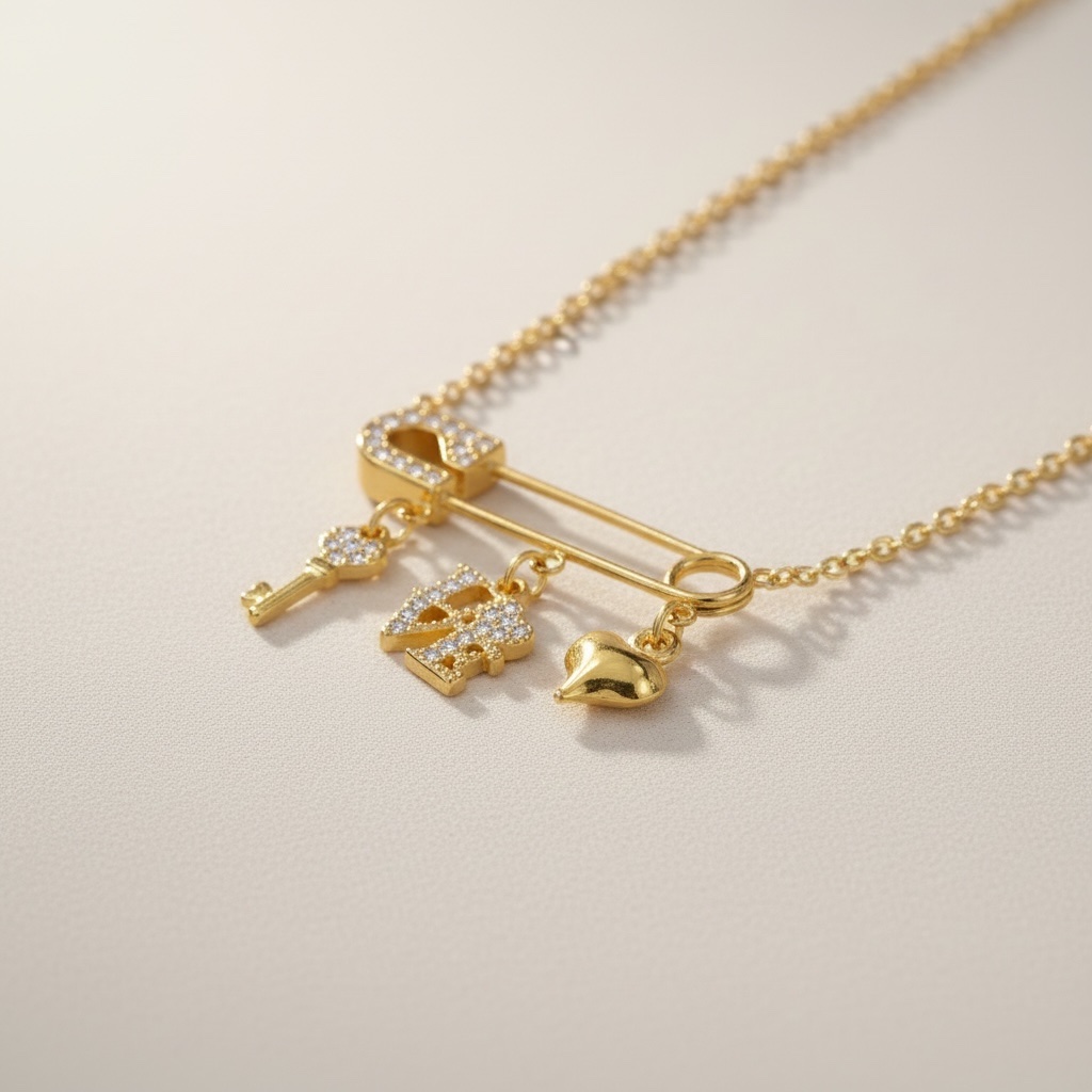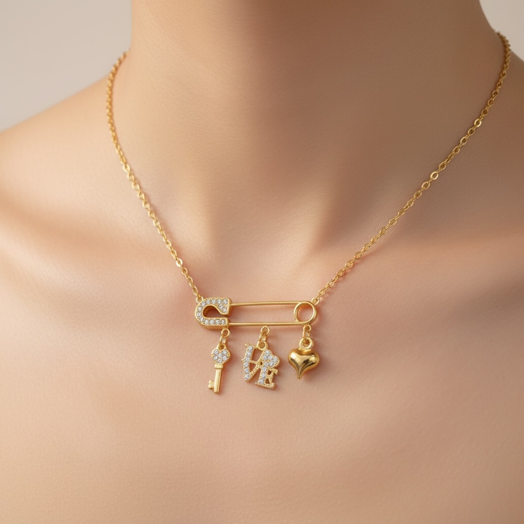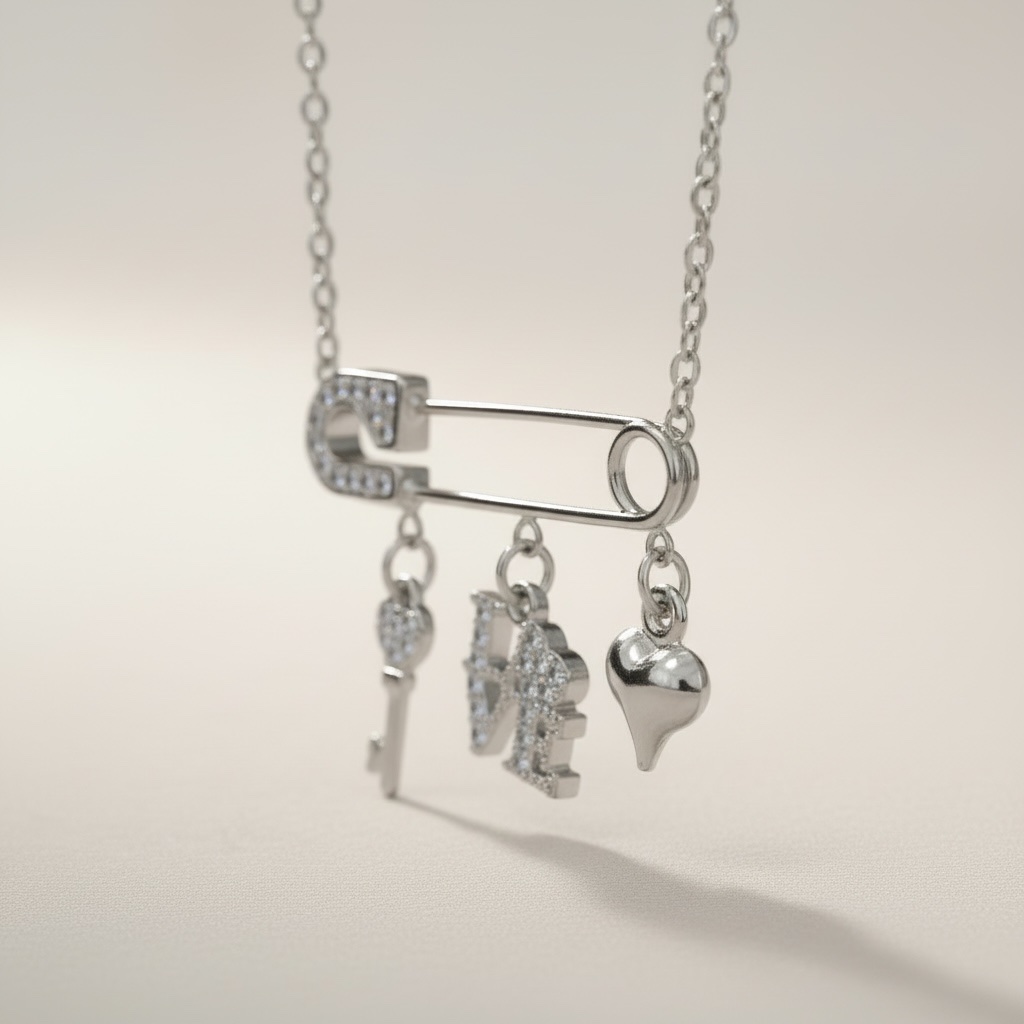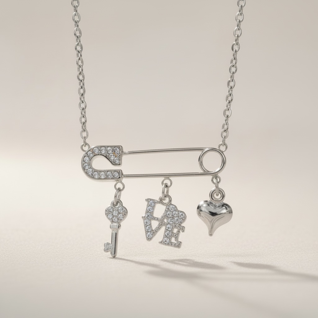 Το Love Charm Safety Pin Necklace είναι ένα μοναδικό κόσμημα που συνδυάζει ρομαντισμό και μοντέρνο στυλ. Η παραμάνα διακοσμείται με τρία ιδιαίτερα charms – ένα κλειδί, τη λέξη LOVE και μία καρδιά – δημιουργώντας ένα συμβολικό και εντυπωσιακό αποτέλεσμα. Οι λαμπερές πέτρες προσθέτουν φινέτσα και λάμψη, ενώ η κατασκευή από ανοξείδωτο ατσάλι εξασφαλίζει ανθεκτικότητα και άνεση για καθημερινή χρήση. Είναι η τέλεια επιλογή για όσες θέλουν να φορούν ένα κόσμημα με νόημα και χαρακτήρα.