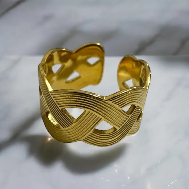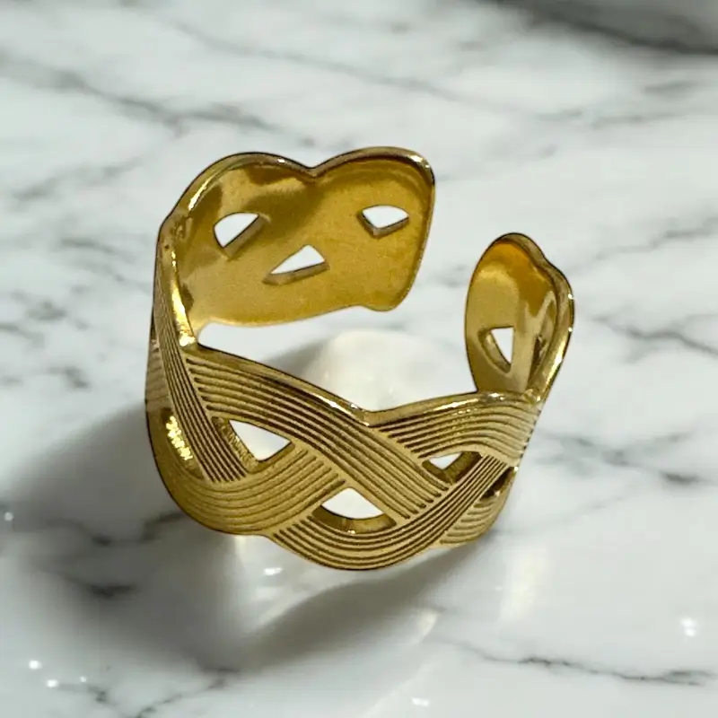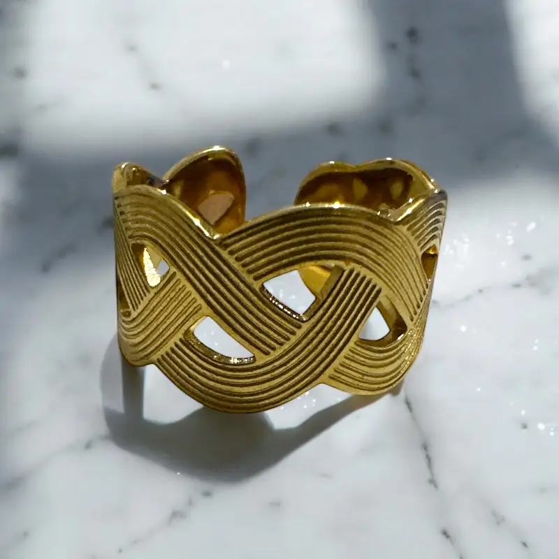 Το Woven Cutout Ring συνδυάζει γεωμετρική κομψότητα με ανάλαφρο design. Οι λεπτές γραμμές δημιουργούν πλεγμένο αποτέλεσμα, ενώ τα cutouts δίνουν αέρα και φως στο σχέδιο. Ένα κομμάτι που δένει ιδανικά με καλοκαιρινό στυλ, αλλά φοριέται άνετα και σε πιο ιδιαίτερες εμφανίσεις.